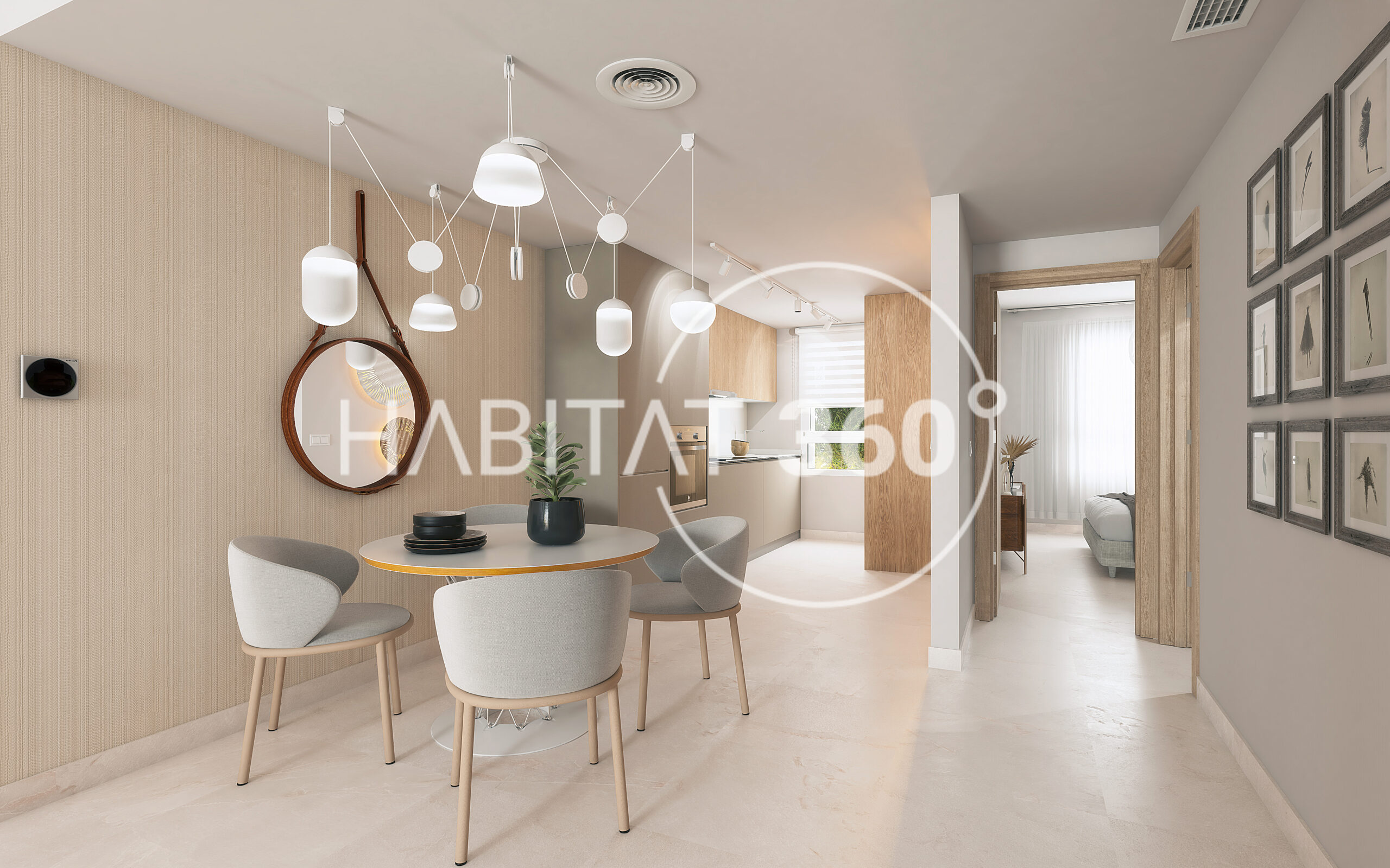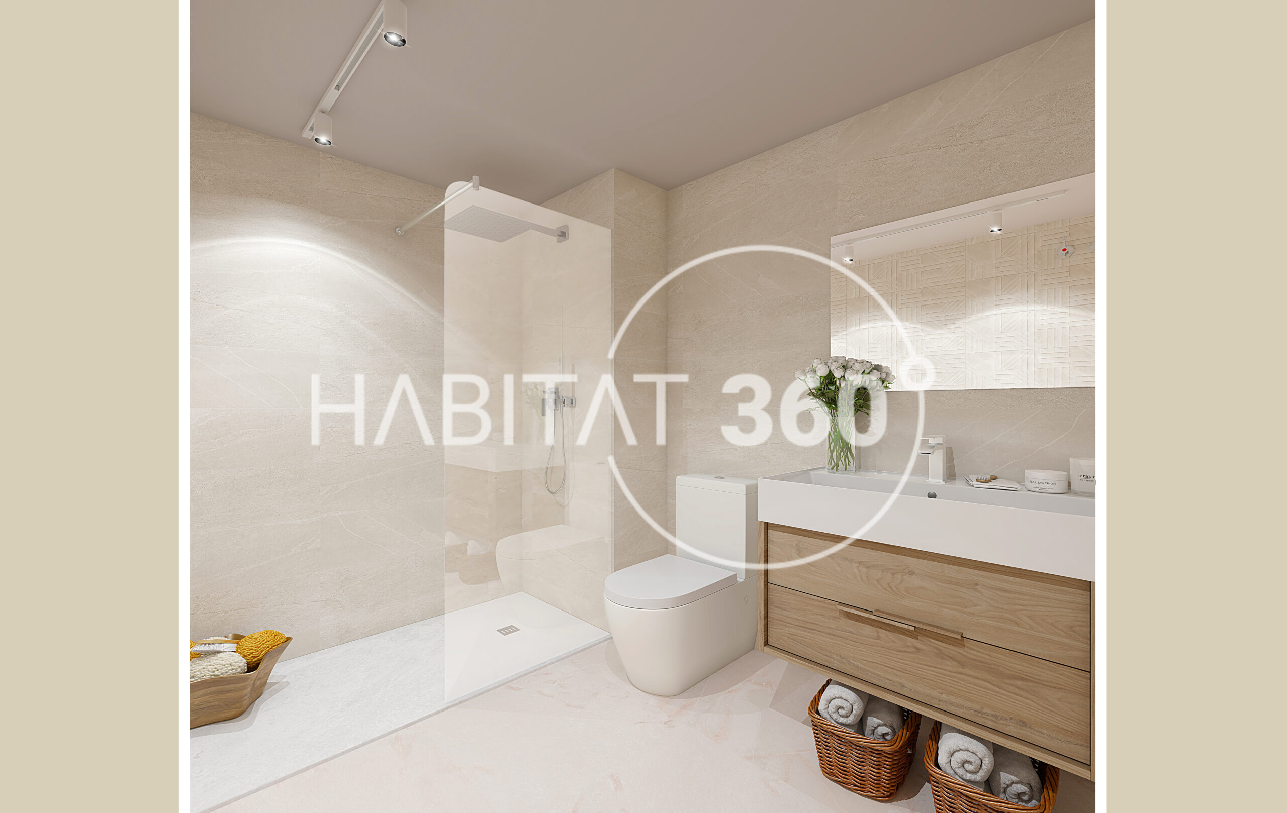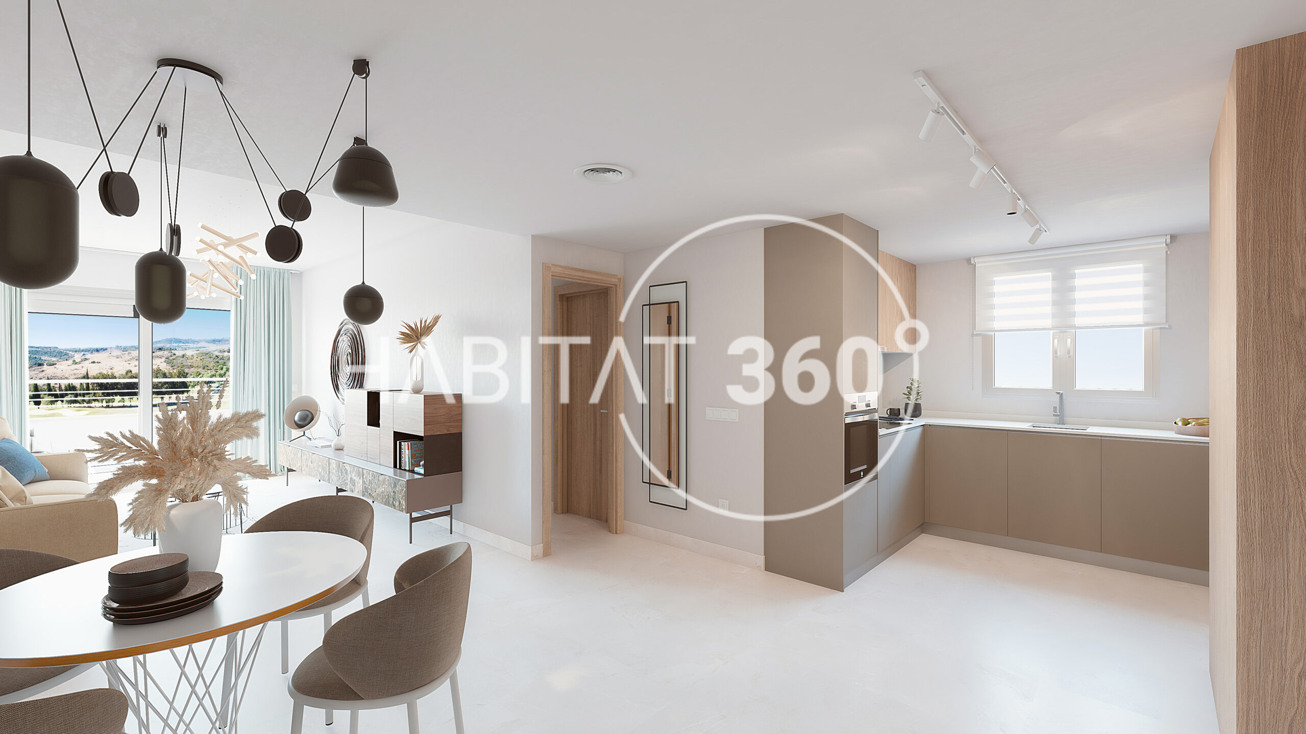 Los apartamentos de 2 y 3 dormitorios y 2 baños cuentan con un amplio salón abierto a la terraza e integran la cocina en el salón, consiguiendo así máxima luminosidad y sensación de amplitud.